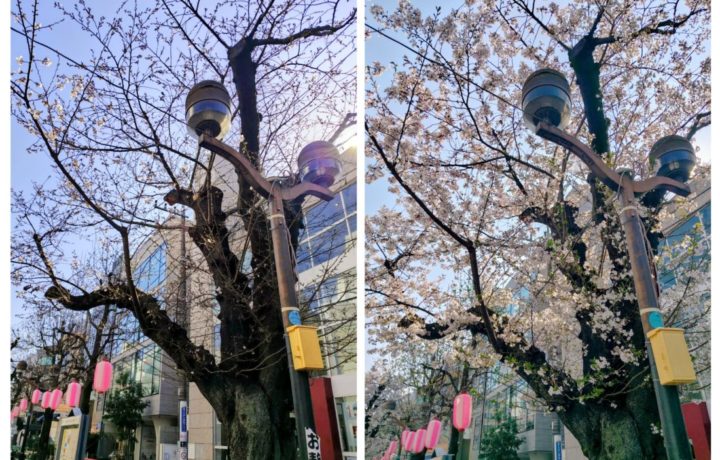 2枚の画像はいずれも左が1週間前(3/21),右が桜まつりの日(3/29)の朝9時頃に同じようなアングルで撮った写真です。今週は雨が降る日が多いので早めに散ってしまうかもしれませんね。