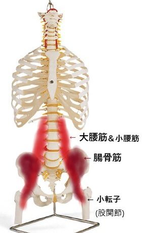 腸腰筋は、大腰筋(人によってはさらに小腰筋)と腸骨筋とを合わせた筋肉の呼称で、背骨の椎体(胸椎の12番~腰椎)と骨盤(腸骨)の前面から股関節前面小転子までの深層部に位置するインナーマッスルです(右模式図参照)。